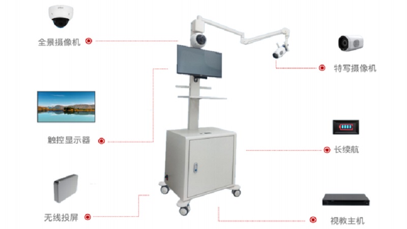 一体化推车设计,无需布线;一键录制直播;双目设计(特写+全景摄像机);适用于机修、汽修、医护等实操教学。